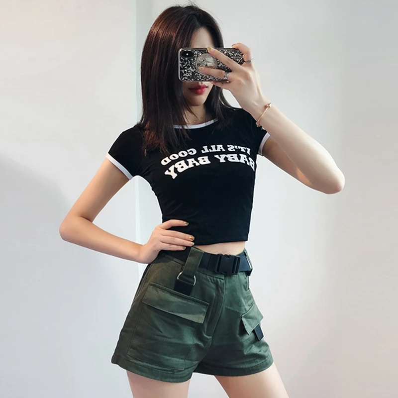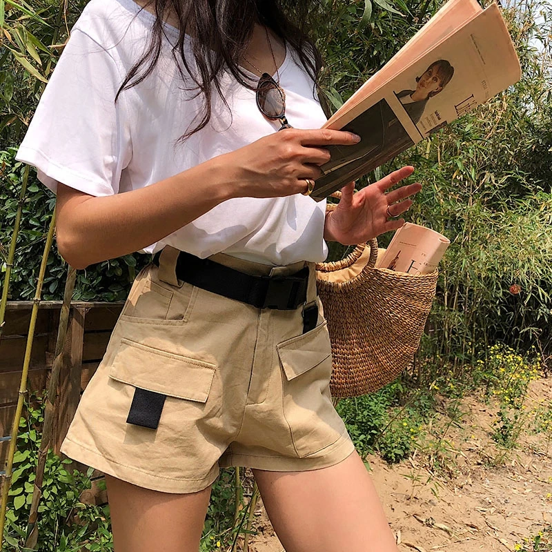 awesome 2019 Elastic high waist shorts for women black summer belt shorts vintage sexy cotton biker pocket