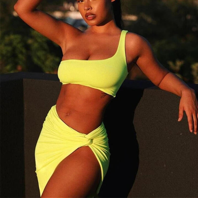 Promo ANJAMANOR Summer 2019 Women 2 Piece Set One Shoulder Crop Top Knotted Slit Short Skirt Sets Sexy Tw
