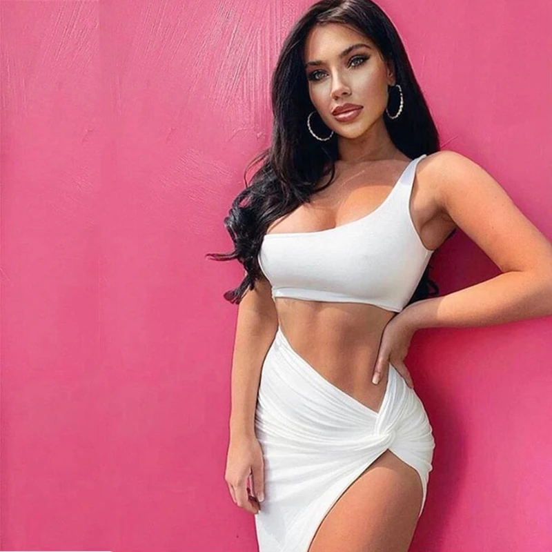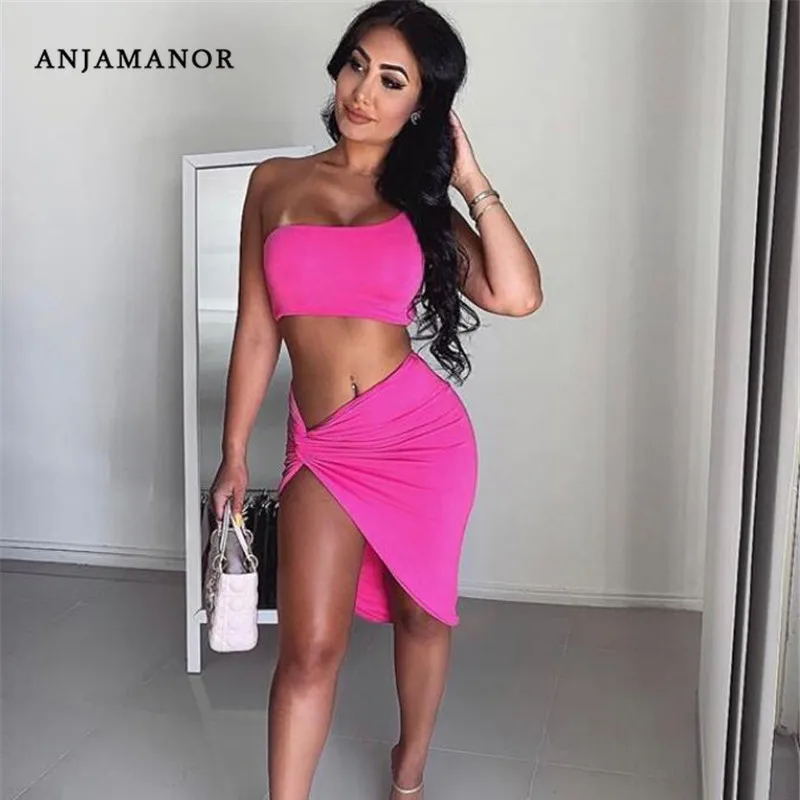 astounding ANJAMANOR Summer 2019 Women 2 Piece Set One Shoulder Crop Top Knotted Slit Short Skirt Sets Sexy Tw