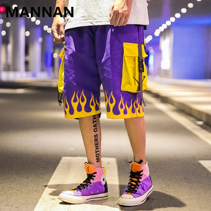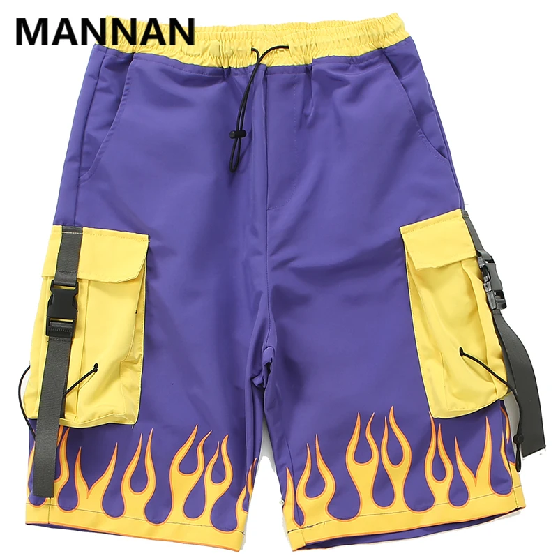 wonderful MANNAN Short Pants Men Casual Hip Hop Pocket Fire Streetwear Print Loose Cargo Shorts Men Summer Fa